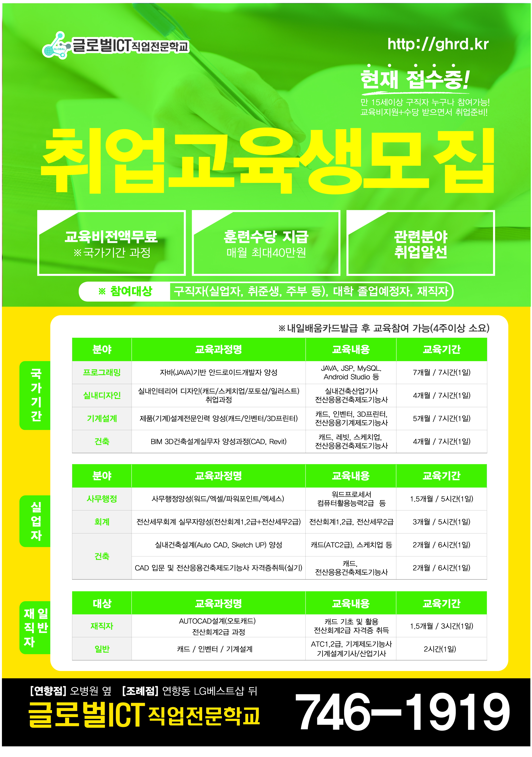 ▶ 교육비 : 구직자(현재 무직자, 실업자, 졸업생, 고등·대학교 마직막학년 재학생 또는 졸업(예정)자 등) 전액무료
